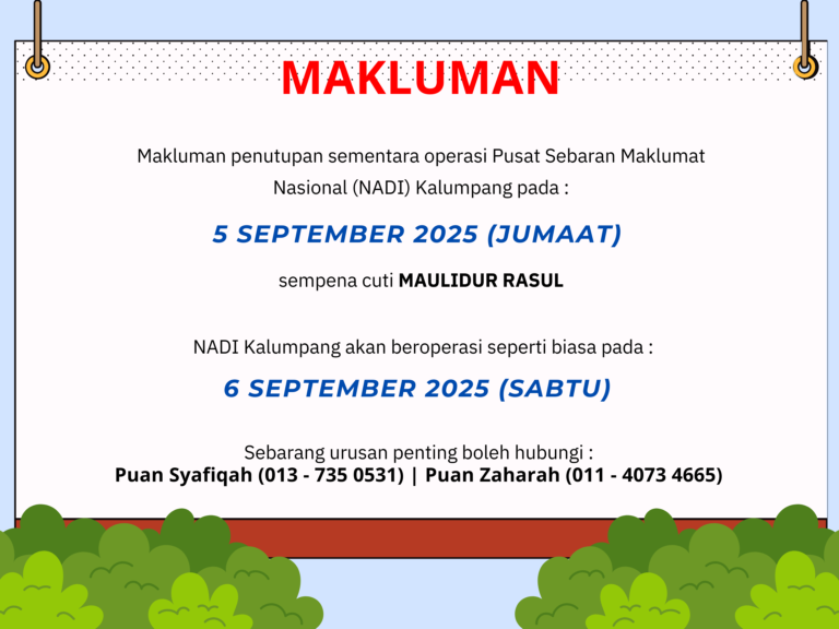 🎉 𝐏𝐫𝐨𝐠𝐫𝐚𝐦 𝐊𝐡𝐚𝐬 𝐌𝐞𝐫𝐝𝐞𝐤𝐚 & 𝐇𝐚𝐫𝐢 𝐌𝐚𝐥𝐚𝐲𝐬𝐢𝐚 @ 𝐍𝐀𝐃𝐈 🎉 Jom ramai-ramai datang ke NADI Kalumpang untuk sambutan istimewa sempena Hari Merdeka & Hari Malaysia @ NADI 📅 Tarikh: 7 September 2025 (Ahad)🕙 Masa: 10.00 pagi – 4.00 petang📍 Lokasi: […]
